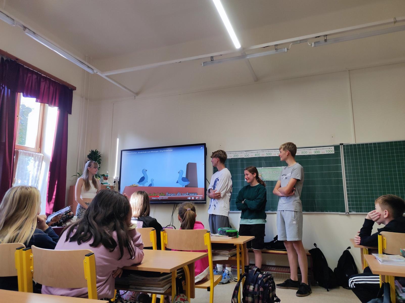 Danach wurden wir in vier Sechsergruppen aufgeteilt und haben uns einen Tanz zu dem gelernten Lied ausgedacht.